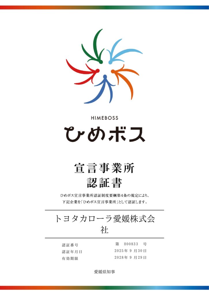 このたび、審査を経て9月30日に愛媛県の「ひめボス宣言事業所」として認証されました。